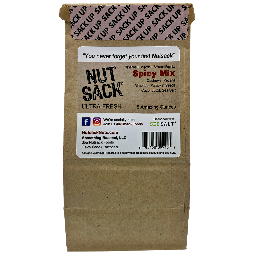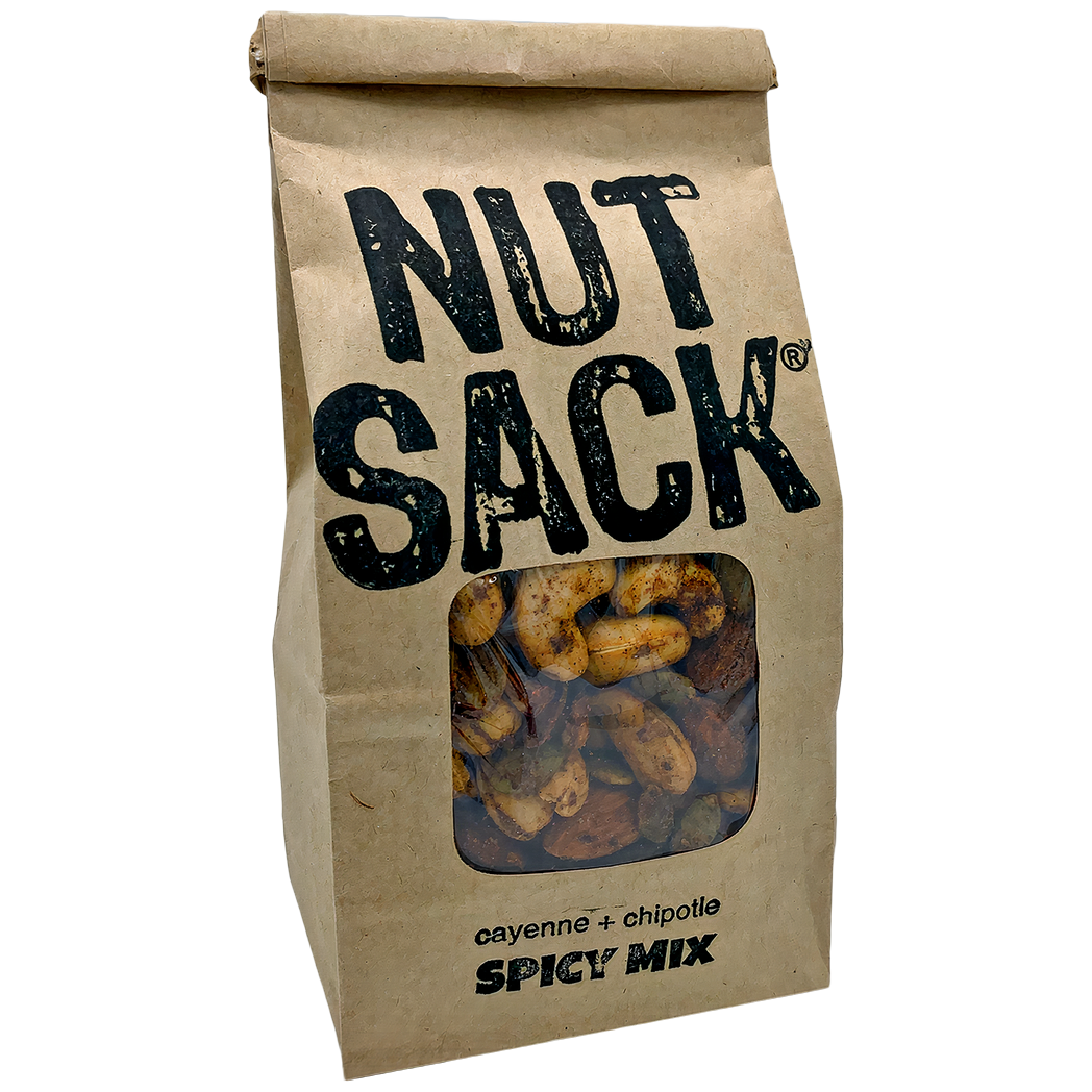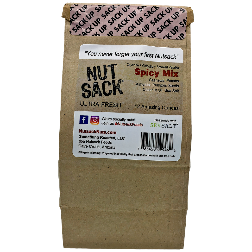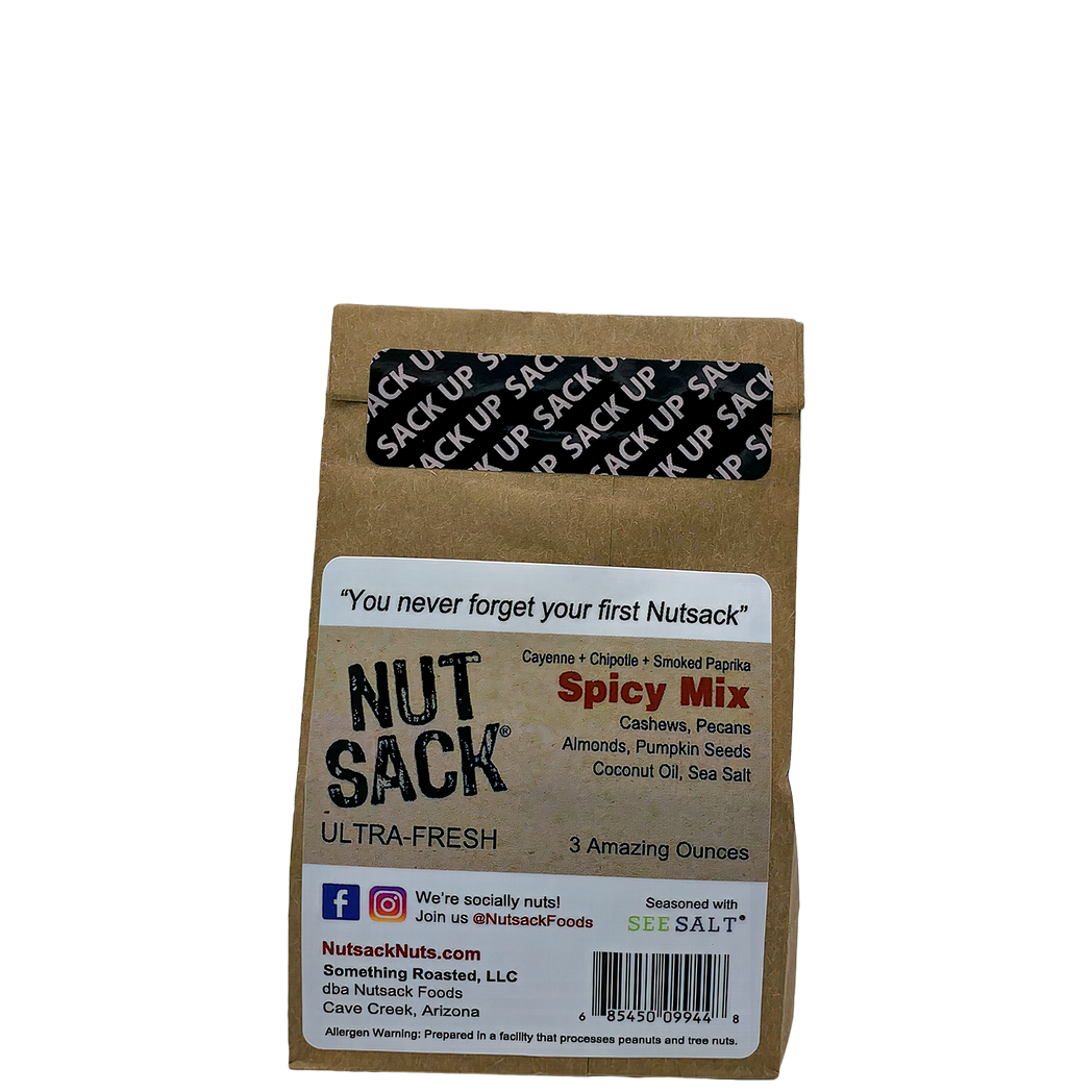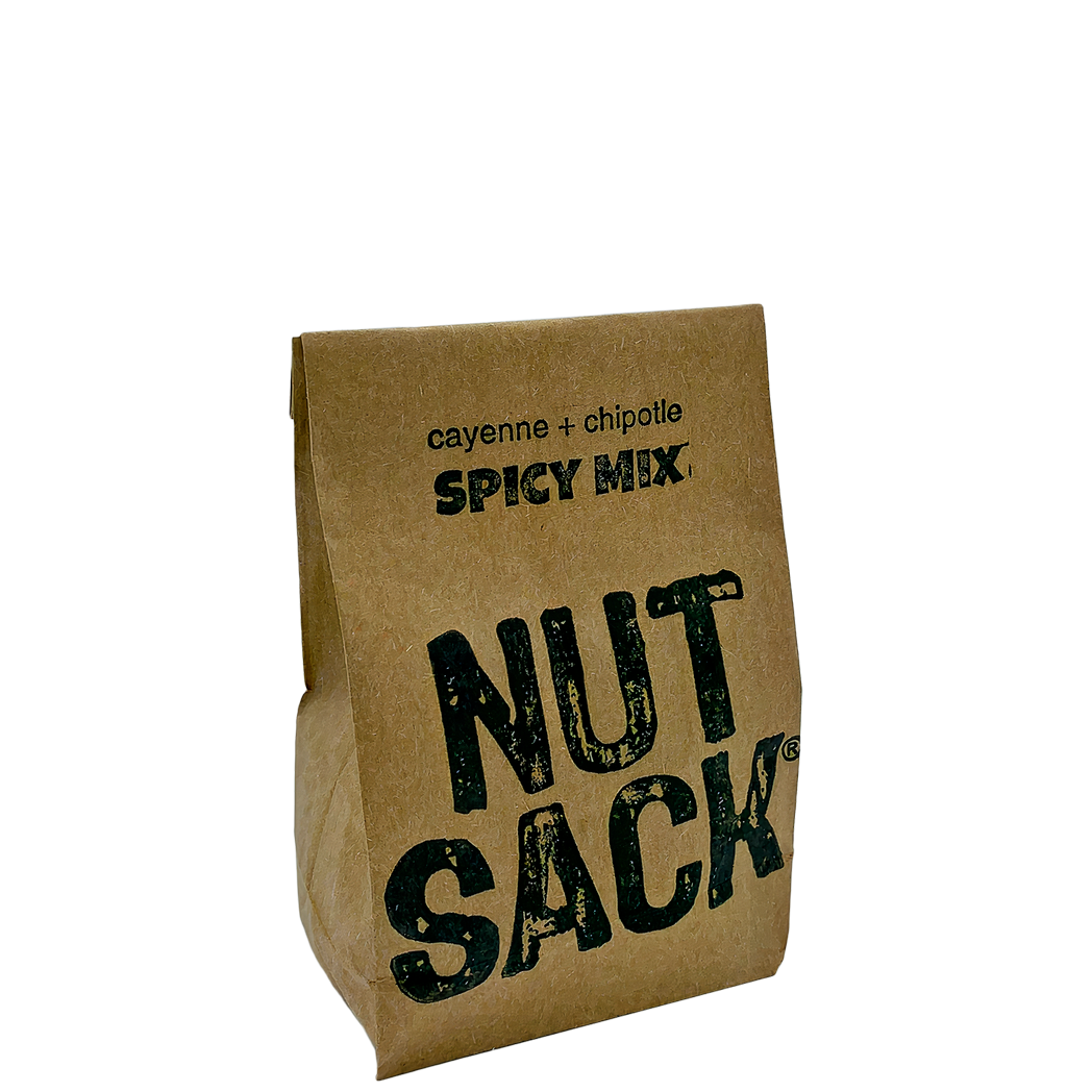 The Spicy Mix Nutsack is loaded with ultra-fresh Almonds, Cashews, Pecans and Pumpkin Seeds, all perfectly seasoned with a house made blend of Cayenne, Chipotle and Smoked Paprika. All of our nuts are roasted with 100% pure and healthy Coconut Oil then perfectly salted with sea salt.