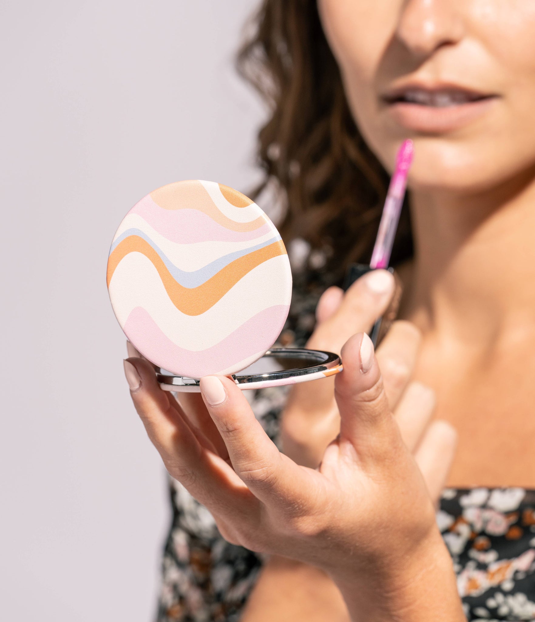 Prints: Purple floral, leopard, pink floral, waves Quick Features: Double sided mirror Standard & magnified views Secure magnetic closure Merchandising Details: Boxed and peggable Ships in a free counter display - super small footprint perfect for checkout and register!