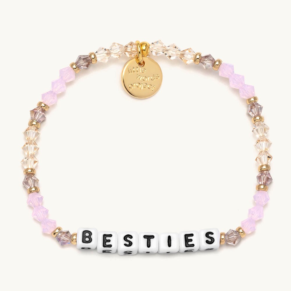 Little Words Project Bracelet with 'BESTIES' beads on a wrist, with jewelry in the background