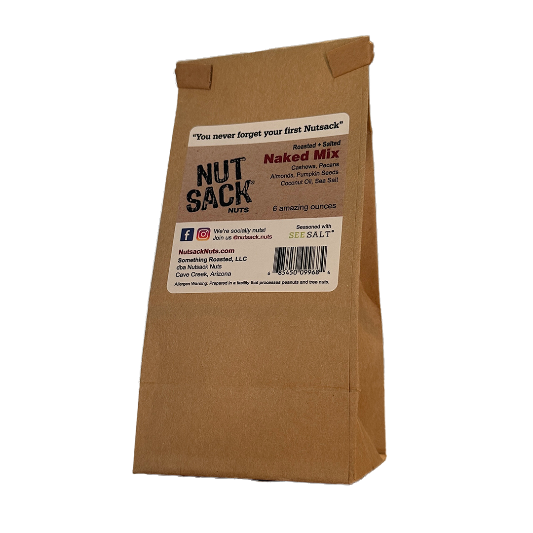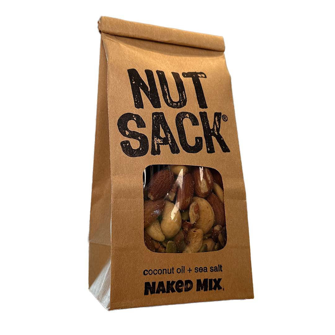 The Naked Mix Nutsack is pure, unadulterated nut love. Freshly roasted Cashews, Pecans, Almonds, Pumpkin Seeds and Sea Salt. Simply delicious.